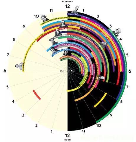 图形可视化能够在短时间内传达丰富的信息信息时代来临,语言、文字表达无力,就应该使用辅助图表来增进语言、文字表达不足的缺点,增进学生对学习内容的理解和交流。更高级的图表(模型)甚至可以显示动态的变量常量,使人可以直观模拟、观察和计算数据的变化状态。如下图所示,这个图表使用了钟表的24小时模式,把每一位伟人的睡眠时段直接用色条标出,使人清楚明了,易于理解。