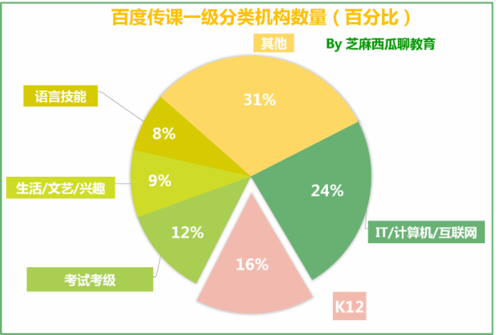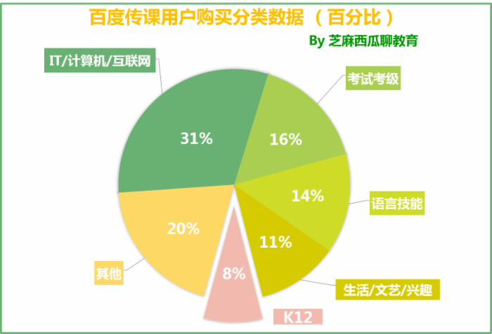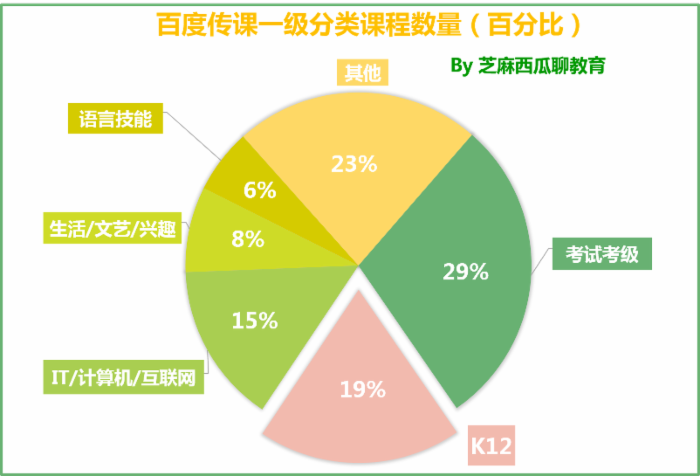 根据公布的数据,百度传课平台一级分类课程数量中,考试考级类课程占29%,面向K12的课程紧随其后占19%,IT/计算机/互联网占15%,生活/文艺/兴趣类占8%,语言技能占6%。一级分类机构中,IT/计算机/互联网课程占 24%,面向K12的课程依然紧随其后占19%,考试考级占 12%,生活/文艺/兴趣类占9%,语言技能占8%。可以看出,从课程供给的角度,无论是分类课程还是机构,K12的数量都稳居第二,占据非常重要的位置。