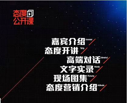 “ 借助互联网力量让知识突破界限,让每个人都能自由平等地接受最优质的知识。这是网易公开课一直都在努力的事。正是基于这样的理念,我们推出了国内首档以营销为核心选题的系列视频栏目《态度公开课》。邀请国内外知名企业CMO、专家学者等为特约讲师,阐述所在领域的营销思路,分享实战经验和智慧观点,与网易一道成为态度营销的践行者与产出者。以期拨开营销迷雾,指引品牌营销航向。”